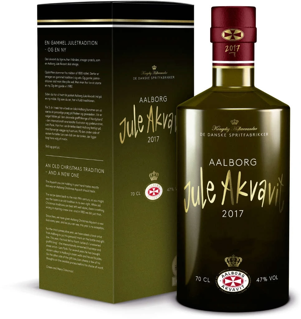 Aalorg Jule Akvavit 2017 stammt aus DĂ€nemark und ist nicht nur etwas Besonderes fĂŒr GenieĂer, sondern auch ein Favorit fĂŒr viele Sammler. Denn dieser wird nur in limitierter StĂŒckzahl produziert und zieht den Betrachter mit der Farbmischung aus tannengrĂŒn, kĂŒhnem Schriftzug und rotem Verschluss in seinen Bann. Mit 47 Volumen Alkoholgehalt bringt er zusĂ€tzlich einen Geschmack von feinsten KrĂ€utern und GewĂŒrzen mit, die den einzigartigen Duft und Geschmack des Aalborg prĂ€gen.