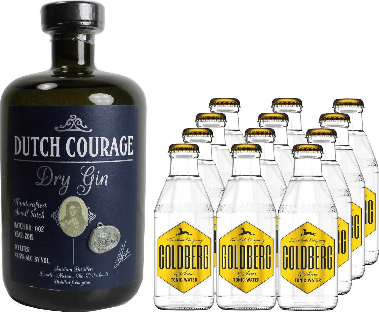 Dutch Courage GIN in einer 0,7l Flasche mit 44,5% Alc. und 12x Limonade von Goldberg in 0,2l Flaschen mit Farbstoff, zzgl. 1,20 ⏠Pfand