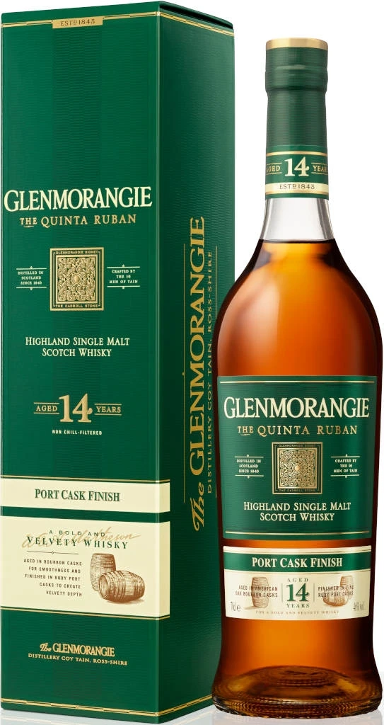 Der Single Malt Whisky reift zunĂ€chst in edlen BourbonfĂ€ssern. Durch die Nachreifung in PortweinfĂ€ssern des portugiesischen Weinguts Quinta erhĂ€lt der Glenmorangie seine besondere Farbe. Der Geschmack des Whisky ist von Schokoladen- und Zitrusnoten geprĂ€gt. Am Gaumen zeigt der Quinta Ruban seinen seidigen, reichen Charakter mit einer feinen SĂŒĂe und trockenen Zwischentönen. Das Finish wird von dem Gegensatz zwischen herber Bitterschokolade und frischer Minze bestimmt.