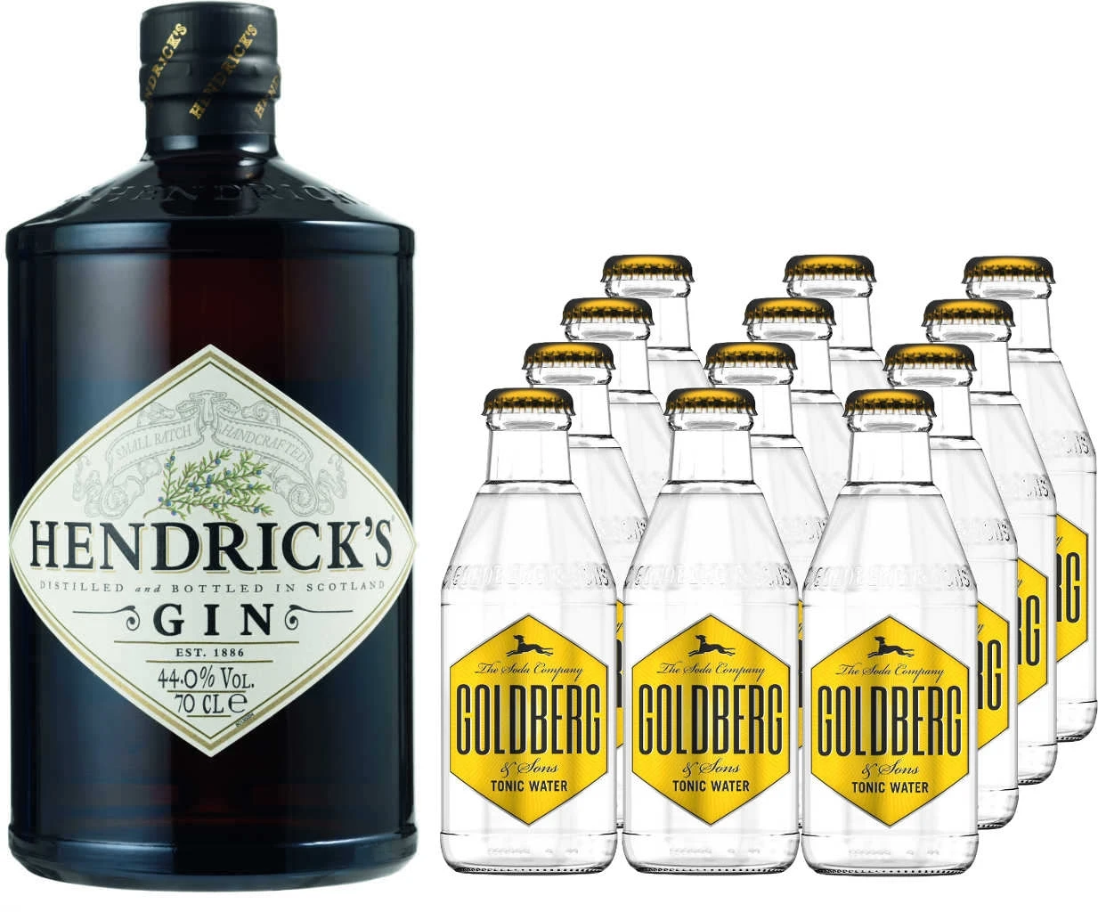 Hendricks Gin in einer 0,7 L Flasche mit 41,4% Alc. und 12x Limonade von Goldberg in 0,2l Flaschen mit Farbstoff, zzgl. 1,20 ⏠Pfand