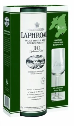 Der Laphroaig 10 yrs. in Geschenkpackung ist der Standard-Whisky der Laphroaig-Destillerie an der Südküste der zu den Inneren Hebriden gehörenden Insel Islay. Östlich der Kleinstadt Port Ellen ist sie die am weitesten westlich gelegene von drei berühmten Brennereien und neben Ardbeg und Lagavulin für ihre körperreichen, schwer getorften Insel-Whiskys bekannt. 1815 von Alexander und Donald Johnston gegründet, blieb sie lange Zeit im Familienbesitz. Heute gehört Laphroaig (gesprochen: „La-froig“ = „Senke in der weißen Bucht“) zu dem US-Konzern Fortune Brands, der hauptsächlich für seinen Jim Beam bekannt ist. Die Laphroaig-Brennerei liegt direkt am Meeresufer und mälzt zumindest einen Teil der Gerste noch selbst über Torffeuer, was ihrem Single Malt Scotch Whisky einen sehr torfigen und rauchigen Geschmack mit einem hohen Phenolgehalt von bis zu 40 ppm verleiht.
