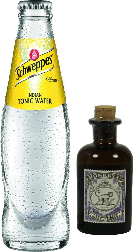1 Monkey 47 Gin 5cl mit 47% Vol.Alc. und 1 Schweppes Tonic Water mit 0,2l zzgl. 0,10 Euro Pfand