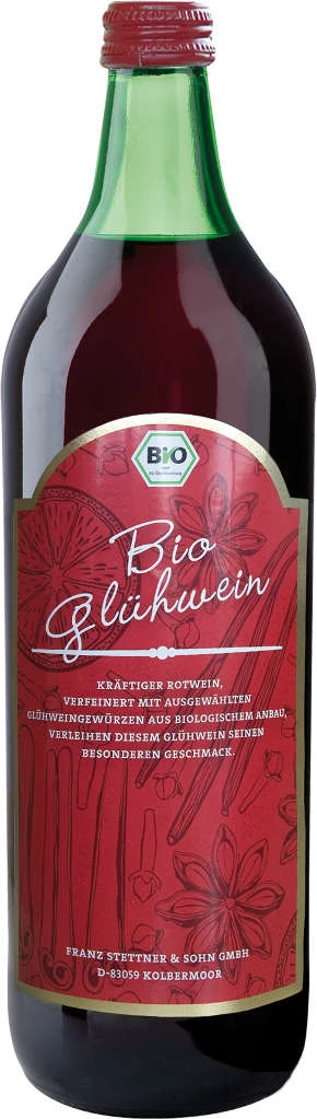 Roter Bio Glühwein von Stettner in der 1 l Flasche mit 9% Vol.Alc