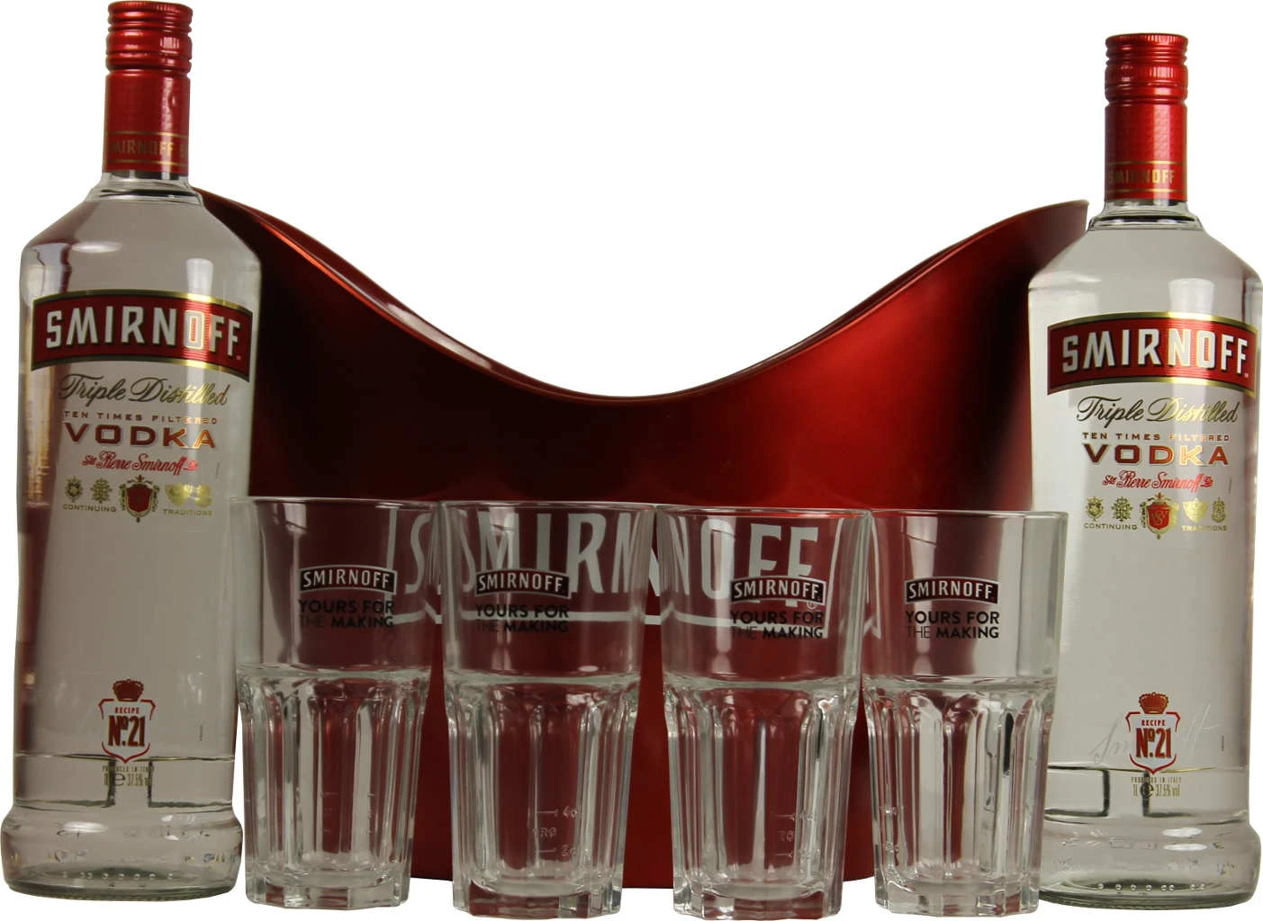 Mit unserem Smirnoff Red Label Coolerset kann die Party richtig losgehen! Es besteht aus einem knallroten Kühler mit dem weltbekannten Smirnoff-Logo, 4 Smirnoff Bechern und zwei Ein-Liter-Flaschen des weltweit best verkauften Vodkas Smirnoff 21, der wegen seines roten Etiketts auch als „Red Label“ bekannt ist.