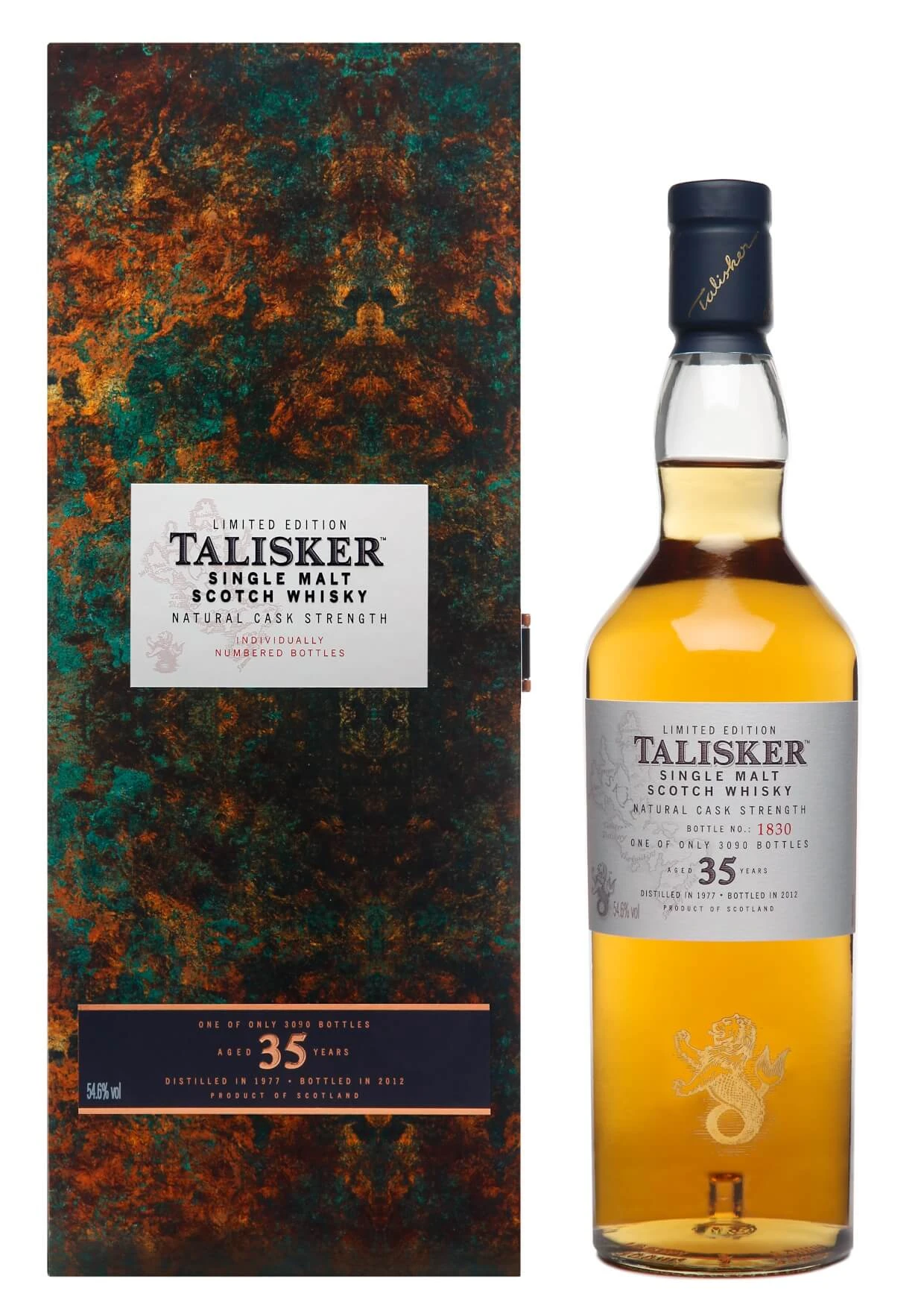 1977 wurde die Talisker 35 Jahre Sonderedition 2012 destilliert und reifte seither in ausgesuchten Ex-Bourbon und Ex-SherryfĂ€ssern, bevor er 2012 in Natural Cask Strength mit 54,6 %Vol. Alkoholgehalt abgefĂŒllt wurde. Er zĂ€hlt zu den exklusivsten derzeit erhĂ€ltlichen Single Malt Whiskys und wird – schon wegen der gering verfĂŒgbaren Menge von insgesamt nur 3090 Flaschen – schnell vergriffen sein!