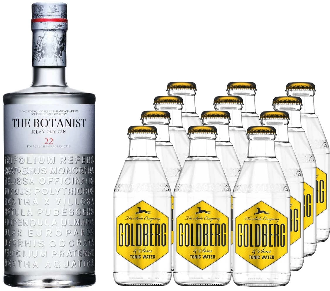 Gin von Botanist in einer 0,7l Flasche mit 46% Alc. und 12x Limonade von Goldberg in 0,2l Flaschen mit Farbstoff, zzgl. 1,20 ⏠Pfand